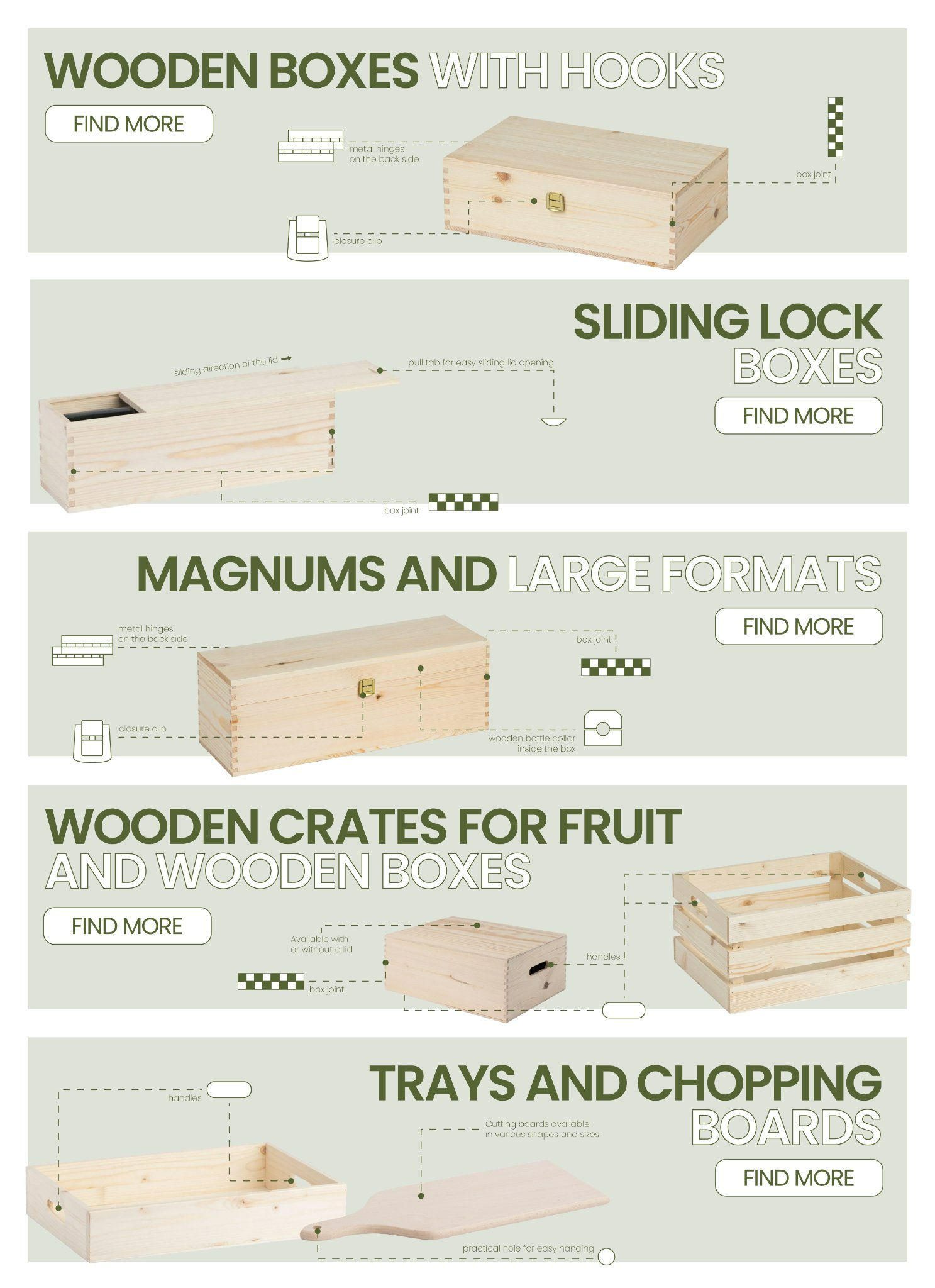 Main categories: WOODEN BOXES,WOODEN TRAYS,WINE BOXES,WOODEN CHOPPING BOARDS,ROODEN CRATES